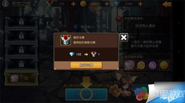 每次挑战都会有不同的奖励,爬塔越高,奖励越丰厚(佣兵魂魄,超值道具等)。每次挑战需要消耗5个令牌。令牌每天0点恢复到上限5点。(首次通关或者挑战失败不扣除令牌)