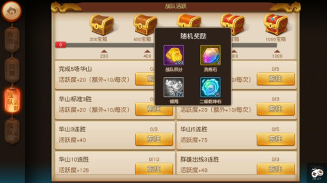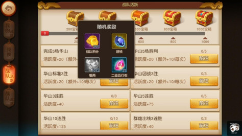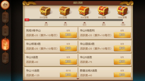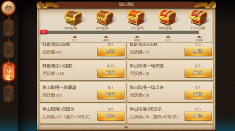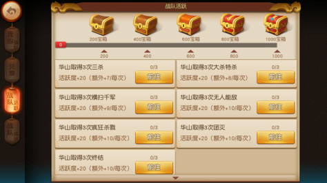 每周战队5局华山,标准、团战3胜,华山3连胜,3次:首杀,双杀,三杀,大杀特杀,横扫千军,无人能敌,疯狂杀戮,团灭,终结,以及,一局完胜,翻盘,反杀。