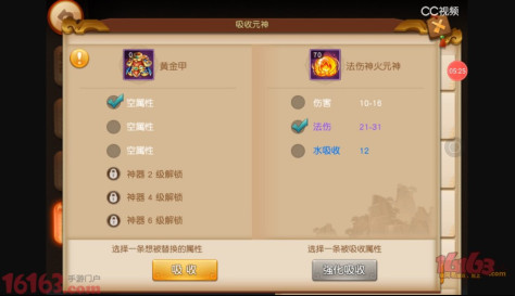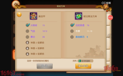 3.一件神器上不能拥有同样类型的属性,相同属性吸收时候,允许高属性替换低属性。比如伤害2替换伤害1。