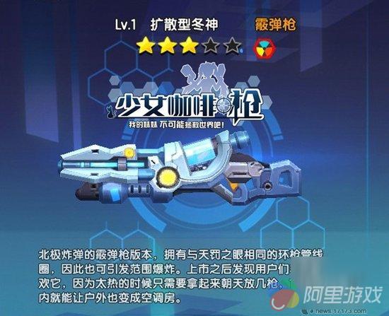 还记得之前给大家提起过的手枪“北极炸弹”不?作为它的霰弹枪版,“扩散型冬神”可以冰冻目标,拥有和天罚之眼相同的环枪管线圈。不仅对天开两枪瞬间周围变冰窖,而且听说对脸轰对面挑衅的家伙一打一个准,一旦冻上三年不用洗澡,赶紧拿上它去找“死敌”战个痛吧!