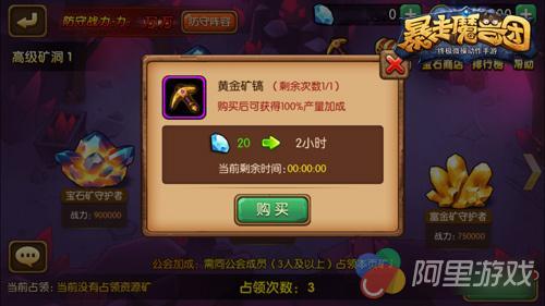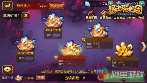 宝石矿洞系统,一般由强悍的怪物守护着,勇士们只要击败BOSS就能占领资源矿。勇士们可单独挑战,也可召集伙伴一同前往,如果是同公会的小伙伴们一起占领更能获得额外加成奖励。