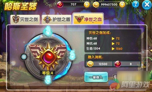 哈斯圣器在玩家达到52级时开启,其分为灭世之剑、护世之盾、净世之血三大部分,对应属性分别为神功、神抗、生命,通过哈斯古境获得的“神圣精华”融入至哈斯圣器内,可大幅提高人物神属性。