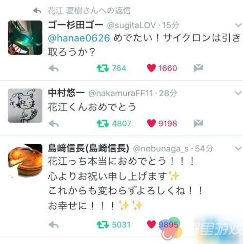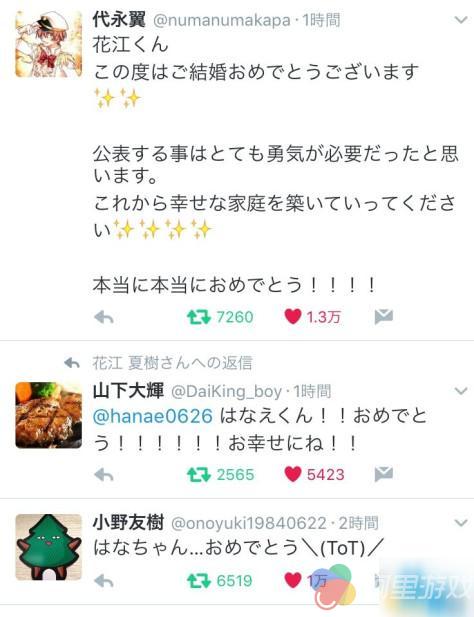 除了粉丝们的祝福外,一大批声优圈内朋友野纷纷给花江送来了祝福。江口拓也、齐藤壮马、加藤和树、大原沙耶香、小野友树、樱井孝宏、井口裕香、安元洋贵,加隈亚衣等知名声优都在推特上祝福花江找到人生幸福。