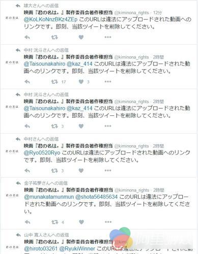 而《你的名字。》官方 twitter 现在正忙着在 twitter 上挨个查水表要求网友删除传播《你的名字。》盗版影片的链接