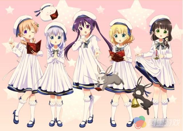 这次活动的视觉图上可以看到保登心爱、香风智乃、天天座理世、桐间纱路、宇治松千夜5位萌妹。充满少女心的粉红色背景,配上5位萌妹的纯白色水手服,即可爱又清爽,让人萌得停不下来。