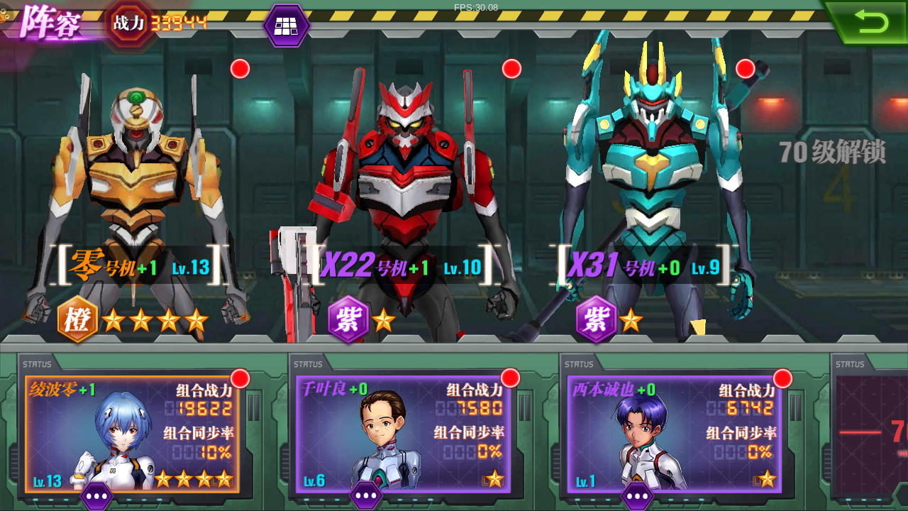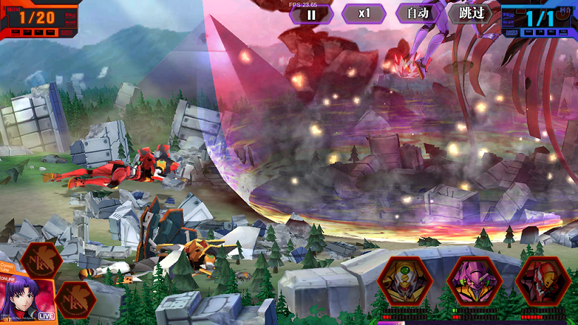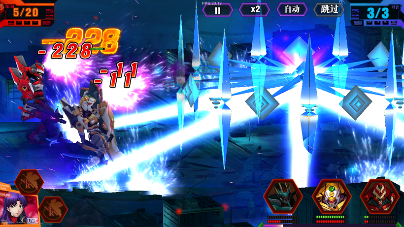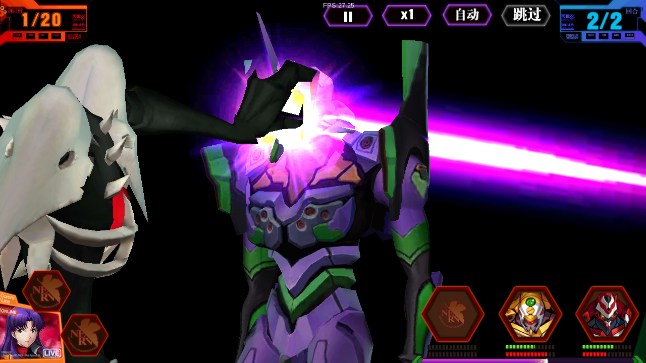 首先,你是不可能直接挂机看着你的几位机师轻松推图的,在屏幕的右下角是当前几台EVA的状态,绿色的生命值,红色是怒气值,最底下那条是合击技能的冷却条。