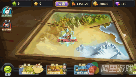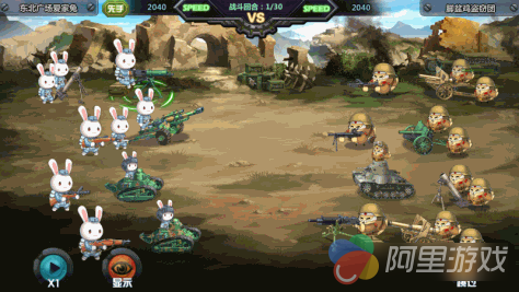 《那兔之大国梦》中出色的画面着实令人惊艳一番。游戏登录界面中,以红星与萌兔为主的游戏LOGO、分列两边“雄赳赳、气昂昂”的军兔与底部厚重金属机械风的菜单界面相结合,Q萌可爱又不失大气磅礴,不仅与游戏整体风格相得益彰,又与动漫主题相呼应,可谓用心良苦。