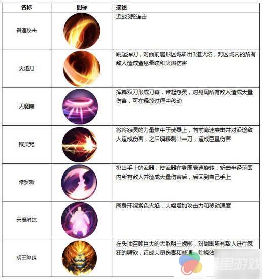 火焰刀+天魔舞+聚灵咒(新手)→天魔舞+天魔附体+修罗斩(中期)→天魔舞+天魔附体+明王降世(后期)