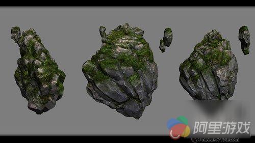 下图中的石块便是以次世代模型的制作方式打造的,观者可以清晰地看到岩石的肌理轨迹,而岩石上的青苔也栩栩如生。与许多游戏中以平面贴图呈现的模型相比,次世代模型将显得更加凹凸立体。在《青云志》手游中,大量的模型都使用了全法线高模制作,并拓扑出准确的Low Polygon,100%高度还原电视剧的剧中场景,让玩家享有沉浸式的游戏体验。