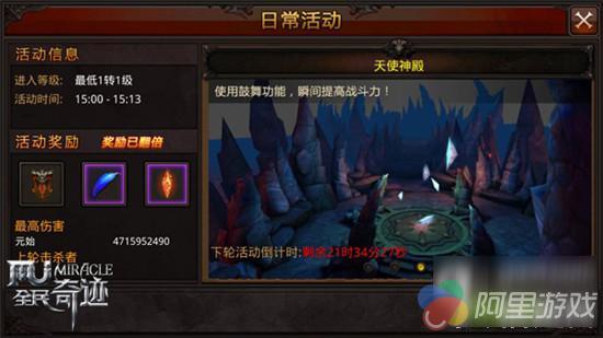 每日15:00-15:13,玩家在活动时间可以进入天使神殿击杀BOSS,最终击杀BOSS和伤害排名前五的玩家皆有额外的奖励。天使神殿是一实力玩家对抗BOSS的绝佳机会,参与战斗的玩家都会获得奖励,但战力最强队伍会有额外丰厚的奖励。