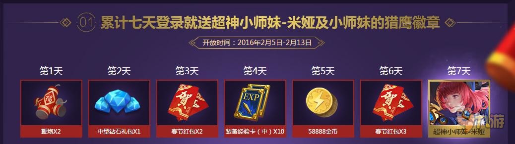 2月7日——鞭炮*1,小师妹的猎鹰徽章*2, 超神小师妹7天体验卡*1