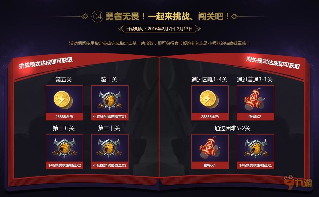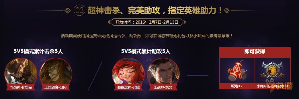 【使用指定英雄活动】:使用指定英雄完成击杀和助攻,获取鞭炮礼包和猎鹰徽章。