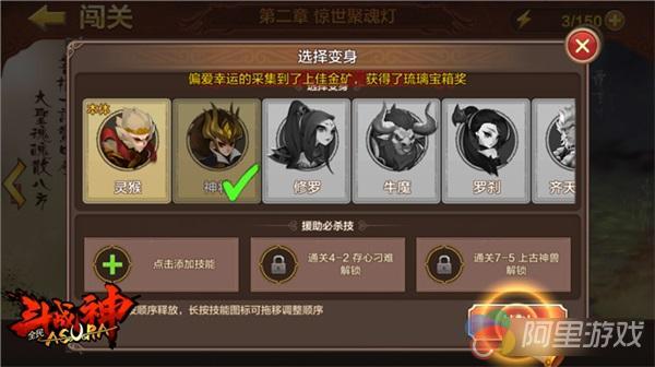 在玩家通关游戏第一章“大闹南天门”之后,系统即会解锁“七十二变”系统。该系统中拥有神将、修罗、牛魔、罗刹、齐天大圣等多种变身角色,玩家通过“神之本源”可获得变身角色。通过连续的战斗,神之本源将不断聚灵升级,变身角色则将随着其的增长而被激活,激活后即可自由切换战斗。