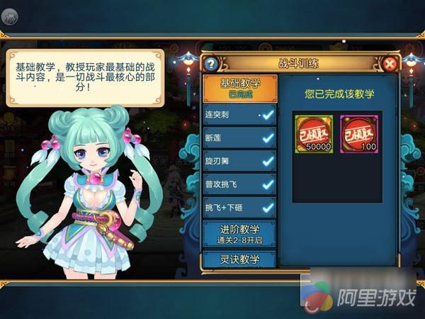 而且,游戏非常重视这三个浮空技,还特地在修炼版块里开了“战斗教学”,把基础操作技能、进阶技能、灵诀技能等不同等级的攻击方法一一教给你,按照教程指示完成动作,还能获得元宝(代币)的奖励——每个阶段的教学都有 4-5 个板块,每个板块奖励 20 个元宝,完成一个阶段的教程就拿到 100 元宝,而且教程难度非常低,对于非氪和微氪玩家来说可谓大优惠。