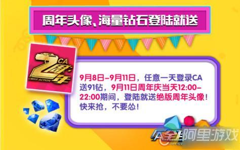 作为周年纪念,头像肯定是最直接的了!陪伴CA度过两周年生日的枪友,当然会想要有一款超强纪念意义的绝版头像对不对?9月11日周年庆当天12:00-22:00期间,登陆就送绝版周年头像!另外,最简单、粗暴的送钻福利也上线了,9月8日-9月11日,任意一天登录CA就送91钻。各位枪友,千万千万别忘记上线哦!
