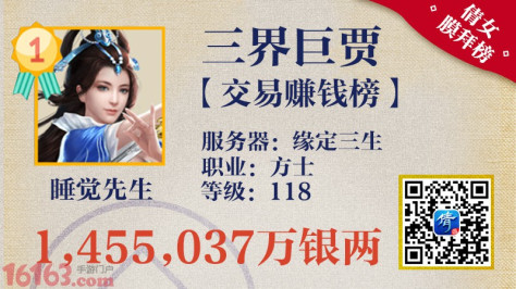 根据《倩女膜拜榜》编辑部的统计,截止8月底,在《倩女幽魂》手游中最成功的商人已经赚了145亿两银两了!