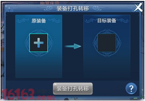 2、弹出装备打孔转移界面,点击+号,弹出备选装备栏。系统会自动筛选符合要求的装备置于装备栏里: