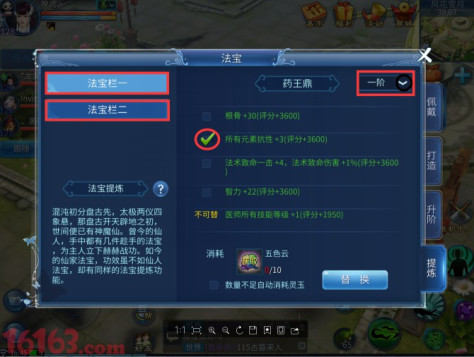 震巽位置的法宝的基础属性条只能洗出气血、攻击、防御、命中、躲避。