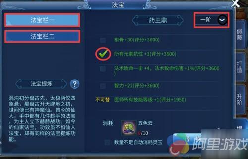 注:提炼仙家法宝时需要特别主要是在法宝栏一还是法宝栏二,如果选错 就会发现白练了,