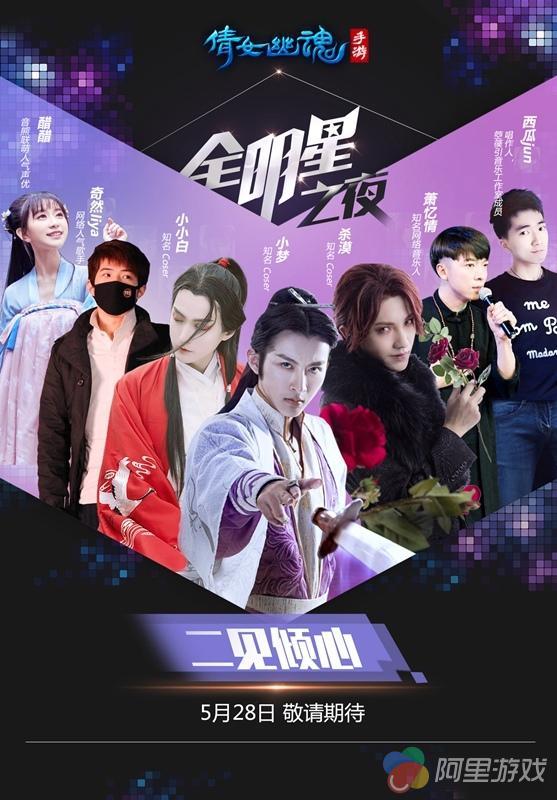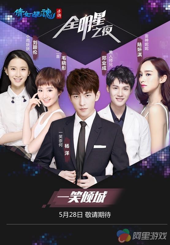 5月28日19:30-21:30,《倩女幽魂》手游全明星之夜将在网易CC直播、虎牙、爱奇艺、优酷、战旗、173、新浪、熊猫TV、Bilibili等平台播放!代言人杨洋将率《微微一笑很倾城》剧组“一笑倾城”帮会群星郑业成(莫扎他)、毛晓彤(二喜)、刘颖伦(小雨妖妖)、陆研淇(雷神妮妮),迎战杀漠、小梦、小小白、奇然、西瓜君、萧忆情、醋醋组成的“二见倾心”二次元大咖战队。