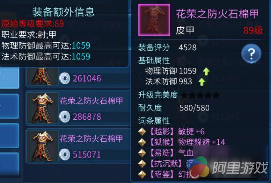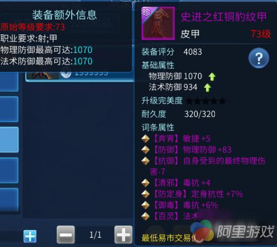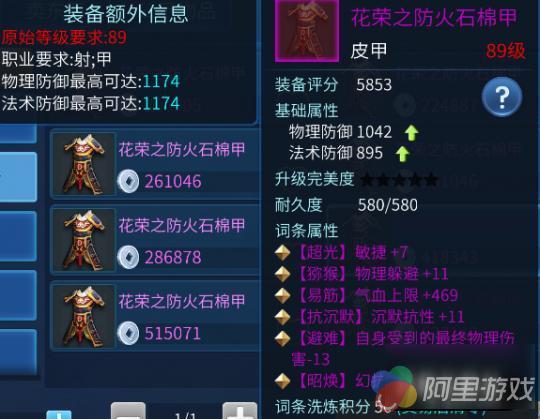 这里先说一下,这件73珍品卖200W。先不说合不合理,我们如果仔细观察一下这件七绝皮甲的防御基础,你会发现这73紫皮甲的七绝基础基础=89紫皮甲的五绝基础。一个是1070,一个是1059。理论上衣服的基础没几个人能洗到双满,所以这两件衣服的可以划等号的。