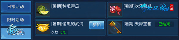 6月24日到7月20日暑假期间,倩女三界为玩家提供了四个暑期欢乐活动,珍稀宝箱将空降全服公共地图,每天签到还有额外奖励。开启宝箱需要宝箱钥匙,拥有西瓜就有机会开出钥匙。玩家参加一条龙、师门任务、关宁校场等日常任务,能够获得“清凉暑期礼包”,打开礼包就有机会得到增加经验的“神秘冰块”和节日专属道具“西瓜种子”。种下西瓜种子后,就能够获得西瓜了。