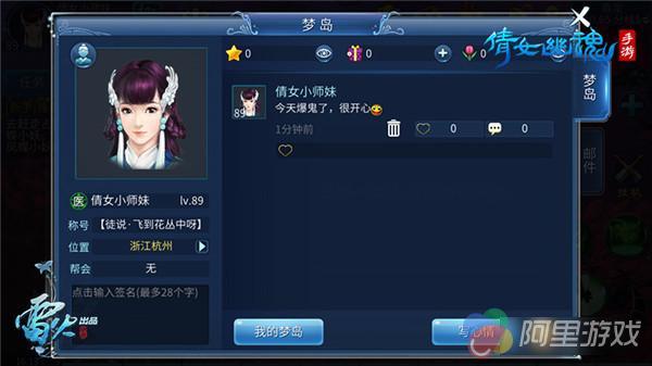 《倩女幽魂》手游真人跨服社交平台梦岛上线后,玩家们好评如潮。日前,打通游戏内外连接的重要一环——个人空间也已正式上线。玩家可以在个人空间中发布状态,也可以进入别人的空间点赞、留言,了解好友最真实的游戏状态。