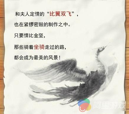 肖奈和贝微微在游戏中同乘的坐骑“比翼双飞”,也是首批曝光的四大坐骑之一,制作人的信中也披露了“比翼双飞”的初稿。而其完全体是否可以还原出小说中形象呢?各位《微微一笑很倾城》的小说粉,可以到游戏内一探究竟。