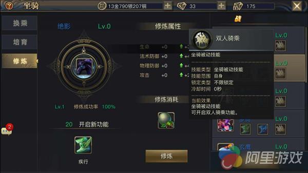本次资料片除了更新新的职业和全服阵营战,还为广大玩家更新了情缘双人乘骑。点击目标,选择“邀请共乘”即可与情侣结伴遨游青丘,想想就觉得美滋滋的。但是,想要双人共乘的前提必须是让坐骑学会“双人乘骑”的技能才可以!坐骑系统更新了修炼功能,在这里可利用白骨洞获得的妖兽内丹修炼坐骑技能。不过要注意的是只有部分坐骑才有双人骑乘(第三个技能),每修炼到20级才可以学习下一个技能。修炼有风险,升级需谨慎。