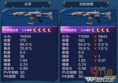 从图中的对比中大家可以发现,65级的K2铁血战龙比起60级的战斗力整整高了5800多点,伤害、穿透、暴击这三个主要属性也都有了一定的提升,弹夹容量和填装时间也有了一定的优化,唯一遗憾的就是射速并没有提升。