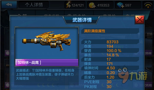 机枪中唯一的一把S级机枪,其强大已经被很多玩家在实战中用各种真实数据证明了,加特林战鹰的子弹倾泻速度可以说是机枪中之最,精准也非常可观,对于掩体的破坏,是很多枪械都无法比拟的,当之无愧的第一,喜欢使用这把机枪的玩家在战斗中不仅可以做到破坏掩体,还能对敌人造成充足的伤害。