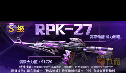 目前游戏中最强火力的枪械,没有之一,其满级满阶火力能够达到91720,这款RPK系列机枪,强化的不是一点半点,其强大的技能和火力值,将是玩家们在PVE玩法中最为强大的火力手,能够想象9w1火力带来的输出有多可怕。
