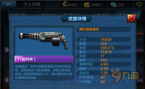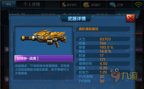 这是一把A级机枪,是加特林-战鹰的前身,也是A级机枪中最强大的那一批机枪,在S级枪械出现之前,它是当之无愧的火力之王,在目前没有一定经济实力获取S级机枪的情况下,T1加特林是玩家最佳选择。