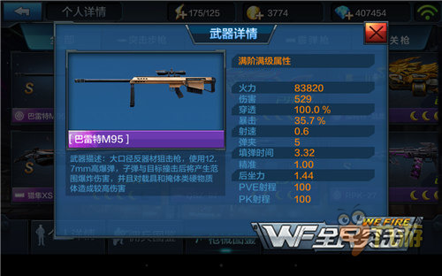巴雷特的伤害在PVP里仅次于赤炎朱雀,不过作为一款连狙属性上是无可挑剔的,实用暴击率远远大于面板上显示的30%,一款50级满配件的M95有和任何枪械一战的能力。
