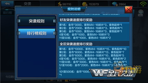 全区的排行榜咱们也不指望了,我们来看看好友排行榜,第一名可以获得M4-16碎片3和紫色配件*1,M4-16是一把非常不错S级突击步枪,第二第三名也只是金币上的区别,枪械碎片都不会少,运气好的话2个月我们就可以获得一把M4-16,这个是其他活动都无法比拟的。