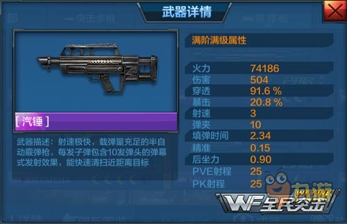 获取难度较低的汽锤其属性也是非常优秀的,504点的伤害搭配上3的射速可短时间内消灭成群的敌人,0.15的精准度虽然看似不高,但依靠枪械的弹幕式射击特性,实际使用中精准度还是非常不错的。