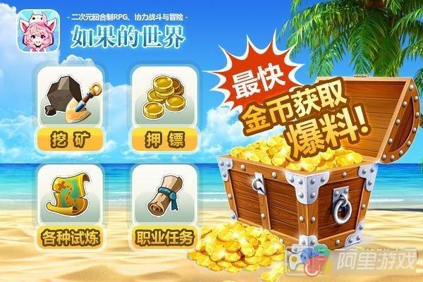角色养成的一个必备物品就是金币!喵酱就先来爆料一下在《如果的世界》中金币的获取方法吧!据喵酱所知,获得金币性价比最多的任务就是和金钱有关的公会运钞任务!除公会运钞任务之外,挖矿任务在获得金币性价比排行榜上排名第二哦,当然,开采的过程是漫长的,不过每开采五分钟就会得到1500个金币呢!