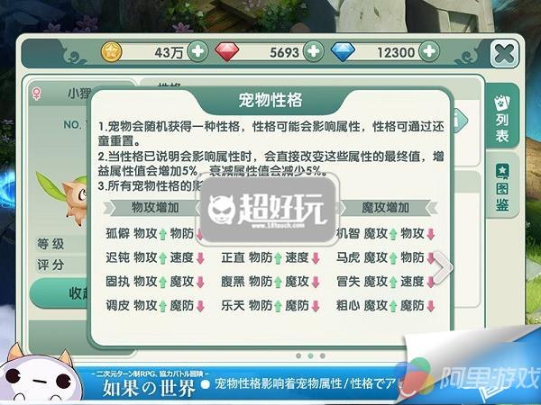3、宠物性格:在如果的世界中,每个宠物都有自己独特的性格。不同性格的宠物影响着他们的属性变化。当然也不是每个宠物的性格都反复无常,努力、勇敢、认真等优秀的宠物仍会以平和心一直陪伴你哦。你想要调教哪一种宠物呢?