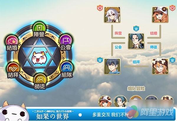 《如果的世界》作为一款回合制手游,最看重的就是交互系统,玩家间可以进行各种互动,可通过语音聊天、拜师收徒、与Ta结婚和义气结拜等交互系统与其他玩家实时互动,不再是一个人的冒险旅程。