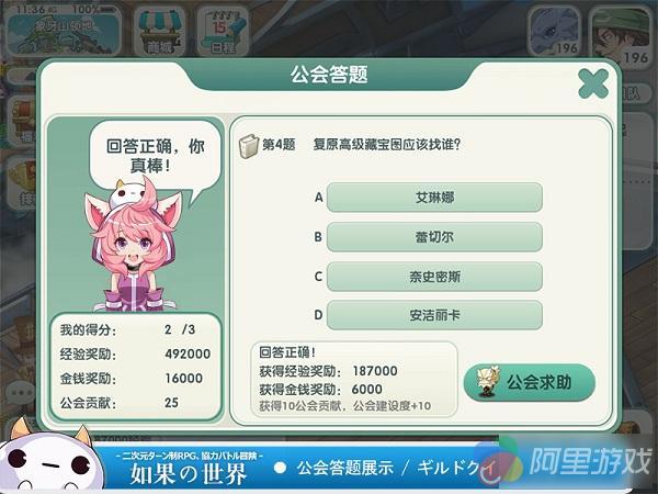 在如果的世界中,答题玩法纳入到公会系统中。米娜桑只要在公会据点中找到“俱乐部理事”,就可以接取答题任务啦~ヾ(o???)?ヾ