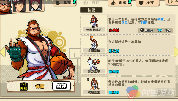 再来看大猩猩的技能,必杀技——金刚怒吼功,打断所有地方动作并晕眩,一个可以两用的技能,除了可以拿回球权之外,也可以晕眩后直接得分,非常霸道无敌!