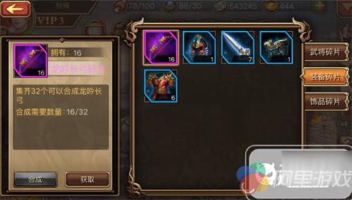 在游戏过程中你会通过很多方式获得大量的装备碎片,当装备碎片数量达到合成要求时,你便可以将这些碎片合成为整件装备。