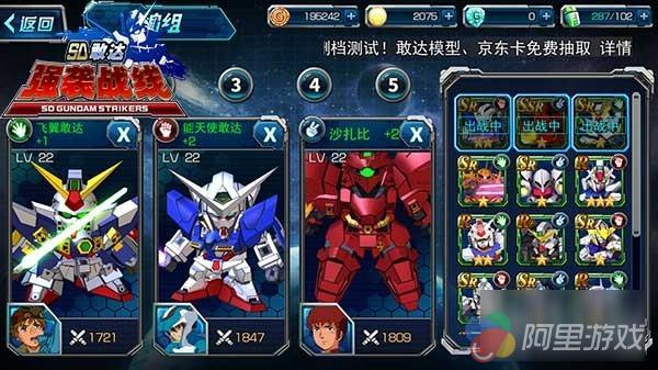 《SD 敢达强袭战线》中每台机体都有会带有“剪刀、石头、布”中其中一个属性,属性之间相互克制,玩家战斗前要根据关卡信息选择不同属性的机体编组。普通关卡大多对于出战的队伍编成没有要求,但是困难模式的关卡中往往会对队伍进行指定。玩家如果想三星通关,就必须根据关卡要求来选择编组。