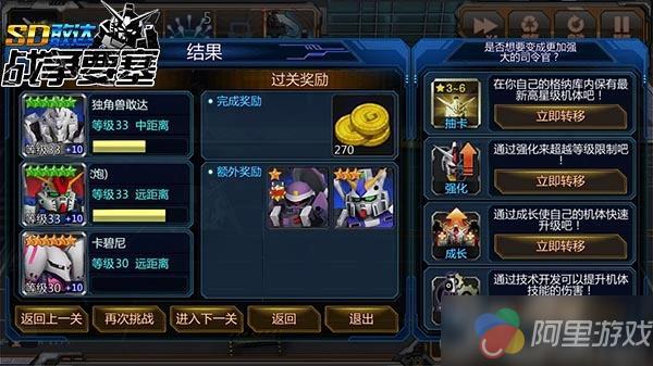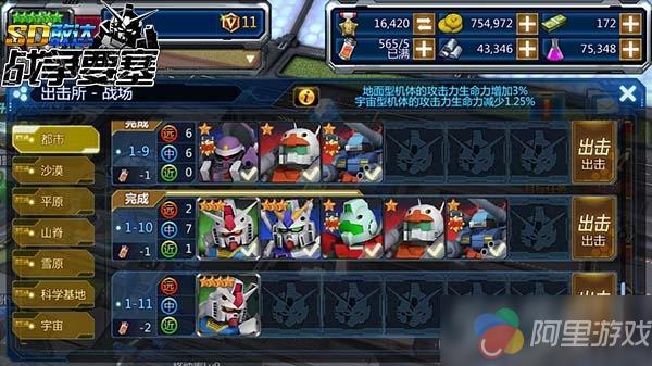 《SD敢达战争要塞》的战场中,每一个场景都有对应的10道关卡,当玩家通关后可以前往下一个场景,同时也会解锁该场景中隐藏的第11个关卡。与之前的关卡不同的是,extra的11号关卡的难度可以说是跨越级的,但是完成后的奖励相比于一般的关卡同样也是有着天差地别的。