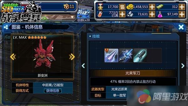 新安洲的三个技能都是对单一敌军的攻击。1级的光束军刀就能提供47%的概率禁止敌方单体机体的行动;二技能336%的伤害,冷却时间只要三回合;三技能火箭炮可以对单一敌军造成362%的伤害,同时冷却时间也只有4回合。