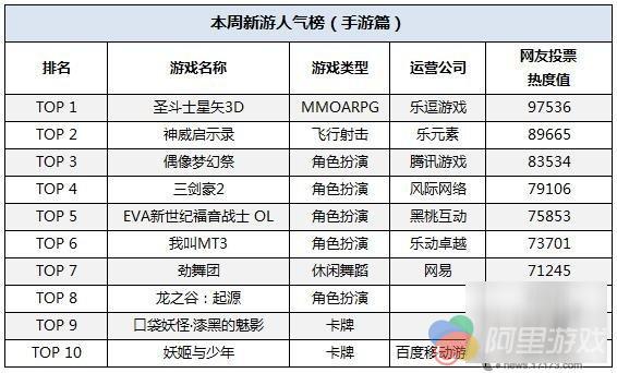 进入2016年第二季度,各大厂商开始贡献产品发力市场,本周将有54款新游开测,其中多款产品拥有IP加持,网易的《劲舞团》和盛大游戏的《龙之谷:起源》还是端游IP。另外,多款动漫二次元手游逐渐发力,乐逗游戏《圣斗士星矢3D》凭借正版圣斗士IP和出色的游戏品质荣登人气榜首位,乐元素《神威启示录》排名不变,《EVA新世纪福音战士OL》和《漆黑的魅影》为新入围产品。在本期榜单TOP 10中,小编选取前3款代表性产品进行详细介绍。