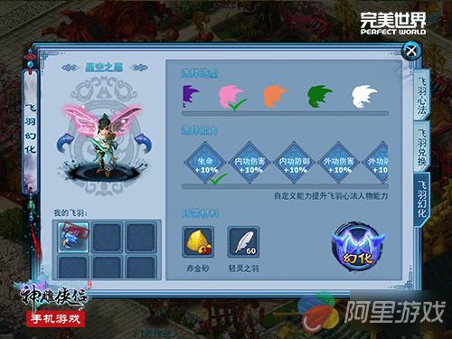 在新资料片中,《神雕侠侣》手游为各位大侠十分喜爱的飞羽系统添加了一项全新功能——飞羽幻化,通过这个全新系统,你将体验到更多“自由定制”的乐趣。在飞羽幻化功能下,通过消耗一定的所需材料,大侠们可以为所穿戴的飞羽选择不同的外观造型和颜色,并在界面中直接预览角色的穿戴效果,上百种造型搭配随你挑选,除此之外,各位大侠还能在飞羽幻化时为正在幻化的飞羽增加一定的幻化能力,自己定制专属的飞羽属性!