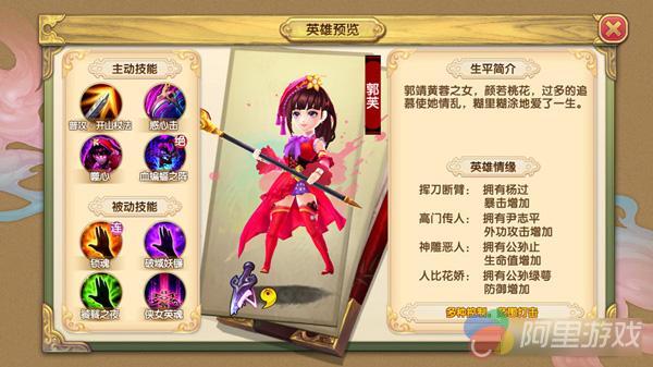 清新淡雅的程英武学上受黄药师衣钵,一曲万里无波既可伤害敌人,也可提升队友伤害,并治疗全队;同样能够以内力催发出桃花浪治疗周围队友,配合睡眠效果可以说是非常强力的辅助英雄。