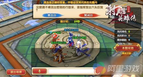 而《射雕英雄传3D》的首部资料片中,全区全服 20 级以上且所在帮派高于 3 级的帮派玩家可以参与该玩法。活动由帮主开启活动,玩家会收到活动邀请,答题开始后,每隔一段时间系统自动出是非题,玩家根据答案颜色,进入相应的区域来选择答案。该玩法可以奖励觉醒商店货币、觉醒商店刷新卷轴和体力。问题大多是射雕英雄传原著以及游戏中的一些剧情内容,比如“见郭靖不肯说出哲别的行踪来,谁指挥放出六头巨獒?”