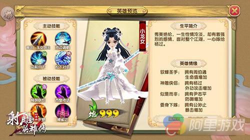 今天要介绍的这第二位英雄想必各位侠友非常熟悉,早在5月份,小龙女就作为“神雕”系的第一个英雄加入了《射雕英雄传3D》手游。她是金庸武侠小说《神雕侠侣》中的女主角,出生时被遗弃在终南山下,十八年来与孙婆婆为伴。十八岁那年与杨过相遇并收其为徒,几经波折后与杨过互生情愫,在经历了劫难重重、几度生死的浩劫后,两人终成眷属,并协助郭靖、黄蓉守卫襄阳,成为扬名天下的“神雕侠侣”。